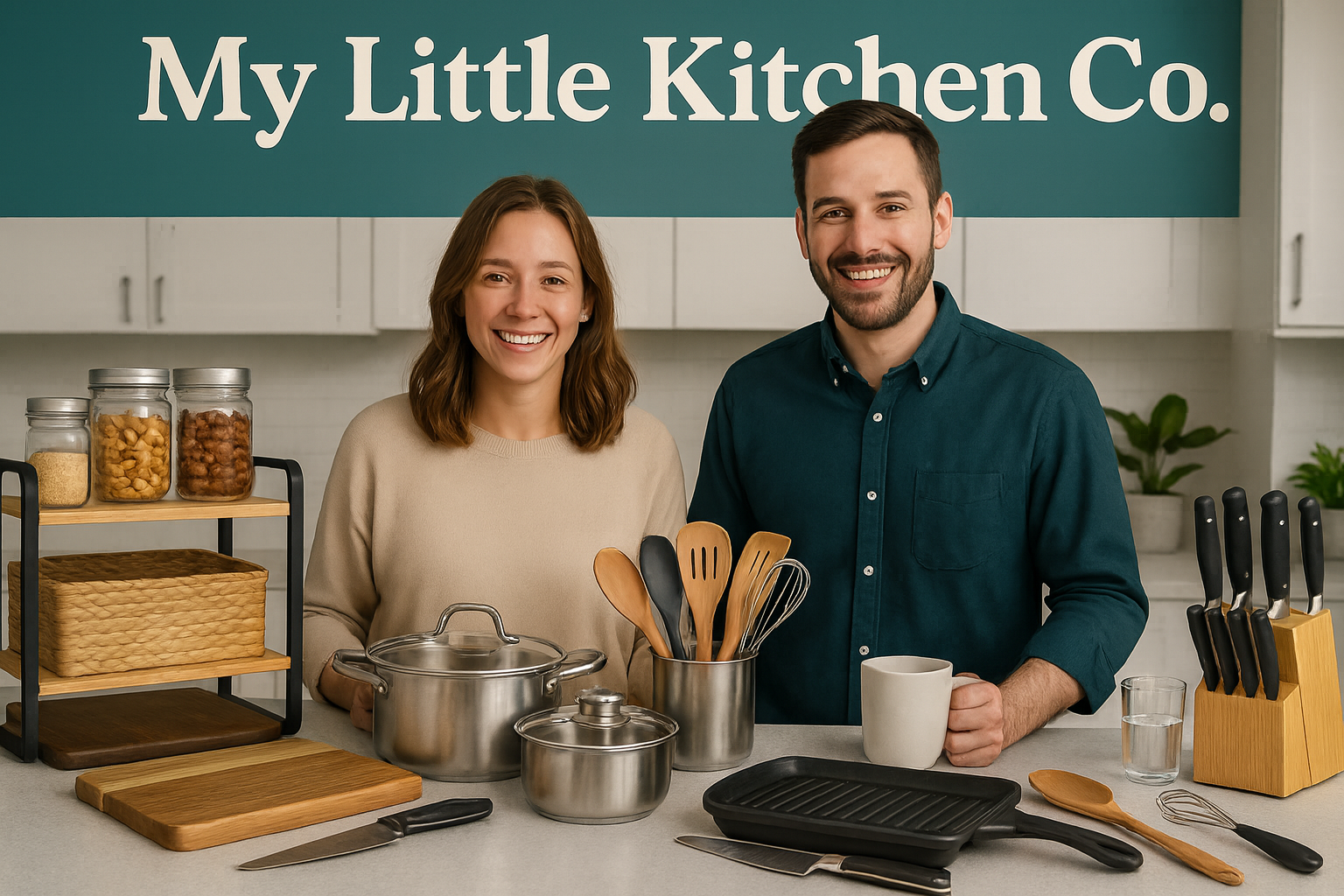 My Little Kitchen Co. offers Organizers & Storage, Cutting Boards, Pots & Pans, Drinkware, Cutlery & Knives, Grill & Griddles, Utensils & Gadgets, and Cookware.